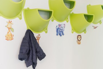 Im Flur stehen eine kindgerechte Garderobe und eine Erwachsenengarderobe. Jedes Kind hat seinen eigenen Kleiderhaken und 3 Fächer zur Verfügung: 1 Fach für die Straßenschuhe, 1 Fach für Geschenke an die Eltern (kreative Werke) 1 Fach, in dem zusätzliche Kleidung, je nach Saison, Platz findet; zum Beispiel: Schal, Handschuhe, UV-Shirt, Sonnenhut usw..