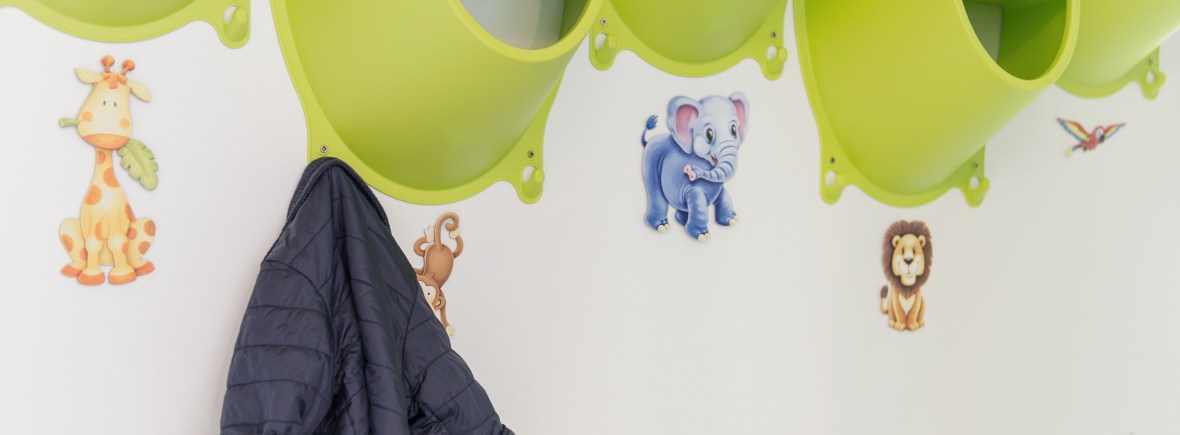 Im Flur stehen eine kindgerechte Garderobe und eine Erwachsenengarderobe. Jedes Kind hat seinen eigenen Kleiderhaken und 3 Fächer zur Verfügung: